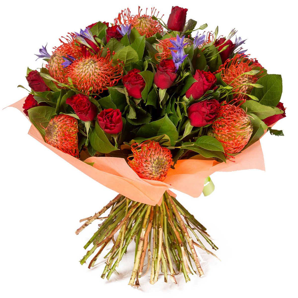 Роза кустовая красная, леукосперум (протея), колокольчик. Упаковка (лента, пленка, крафт, сетка, пленка матовая)