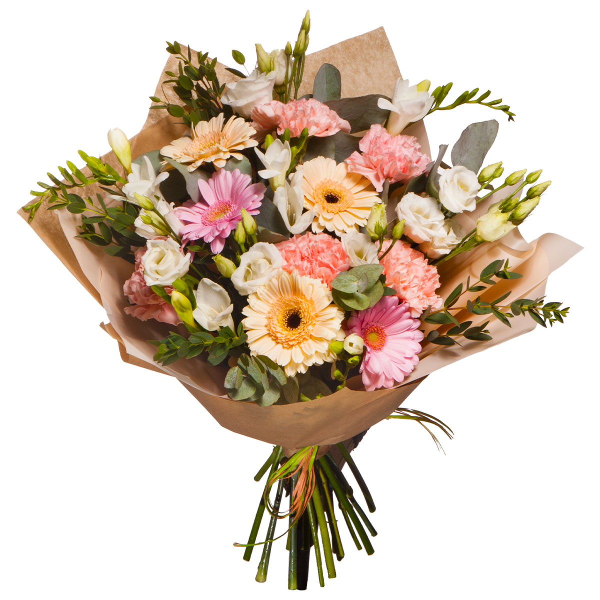 Гербера розовая и персиковая, эустома белая, фрезия белая, гвоздика розовая, эвкалипт, фисташка. Упаковка (лента, пленка, крафт, сетка, пленка матовая)