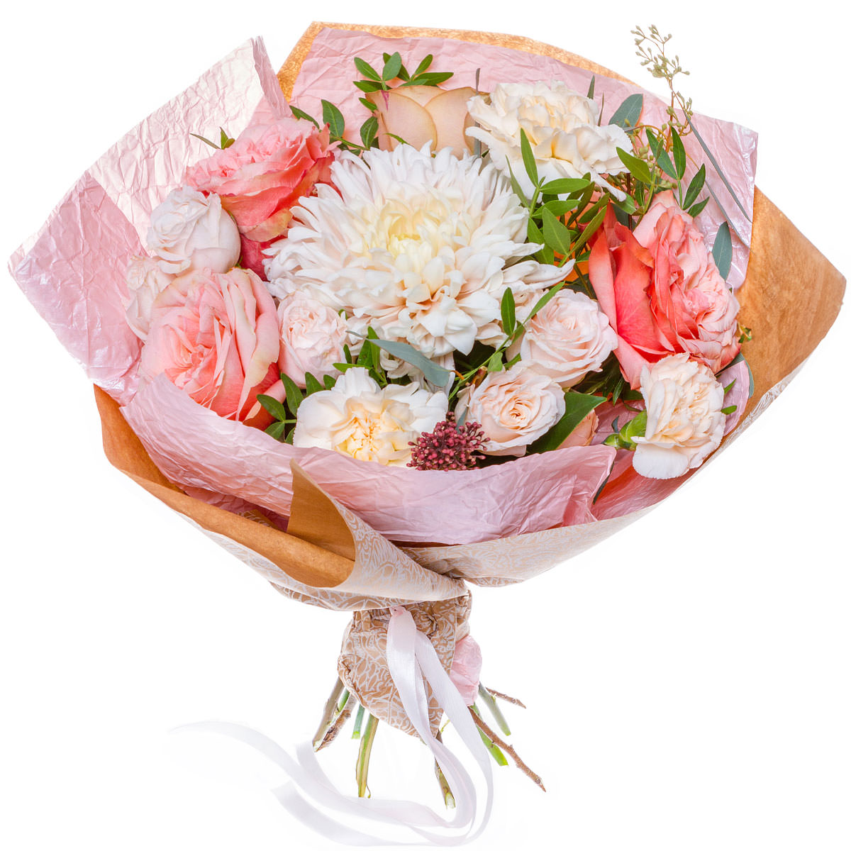 Хризантема одноголовая розовая, роза одноголовая розовая, гвоздика кустовая розовая, озотамнус, фисташка. Упаковка (лента, пленка, крафт, сетка, пленка матовая)