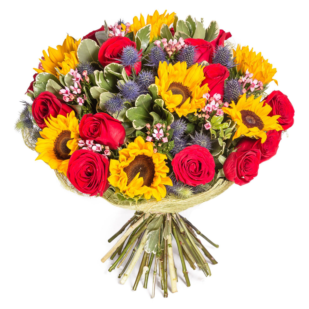 | Состав | Кустовые розы, Подсолнухи, Розы, Хризантемы, Эвкалипт, Эрингиум, Эустомы |