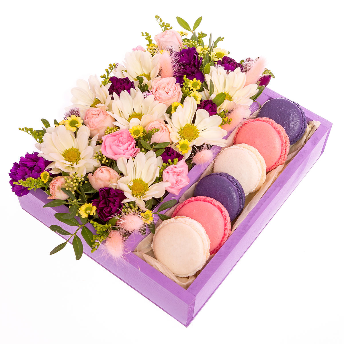 Ромашка белая, гвоздика фиолетовая, хризантема кустовая желтая, лагурус, солидаго, макарон. Упаковка (Корзина, оазис, ящик).