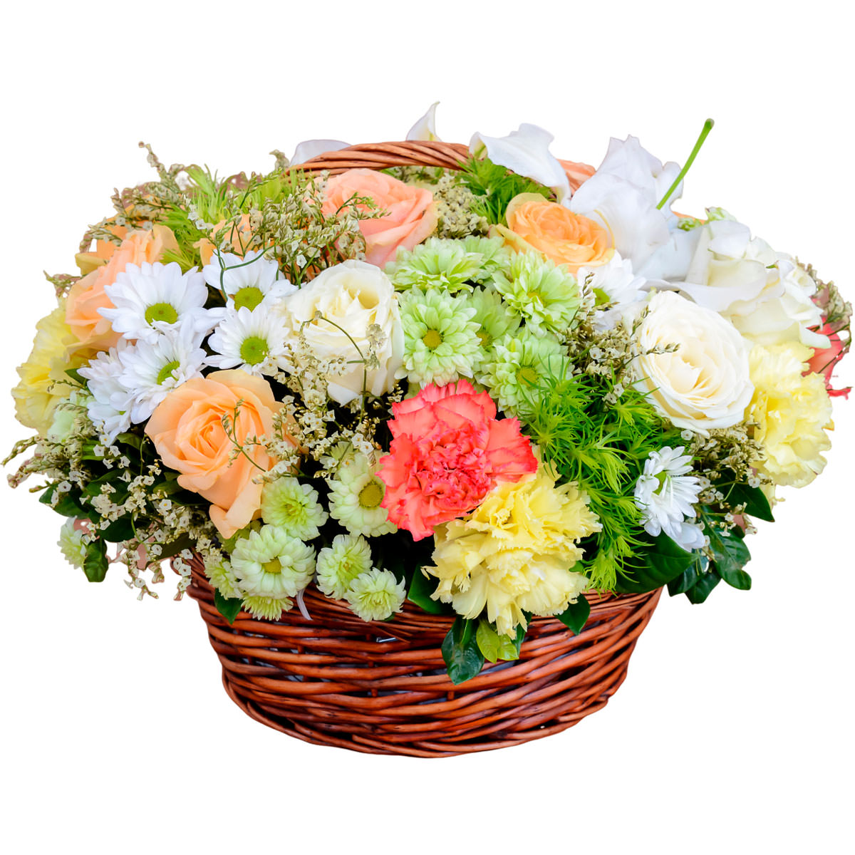 Роза одноголовая персиковая и белая, хризантема кустовая белая и желтая, гвоздика розовая и желтая, зелень. Упаковка (Корзина, оазис, ящик).