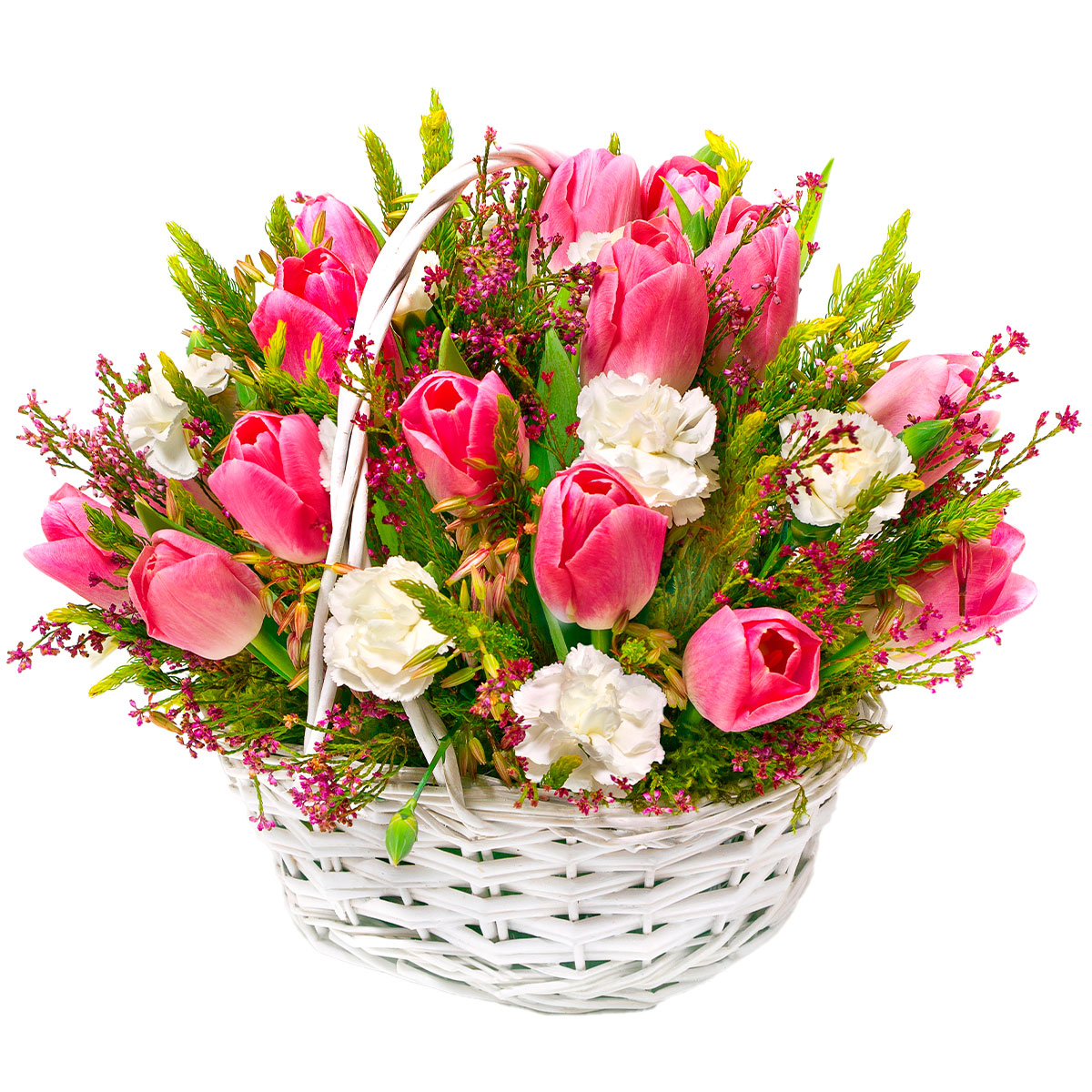 Тюльпан розовый, гвоздика белая, зелень. Упаковка (Корзина, оазис, ящик).