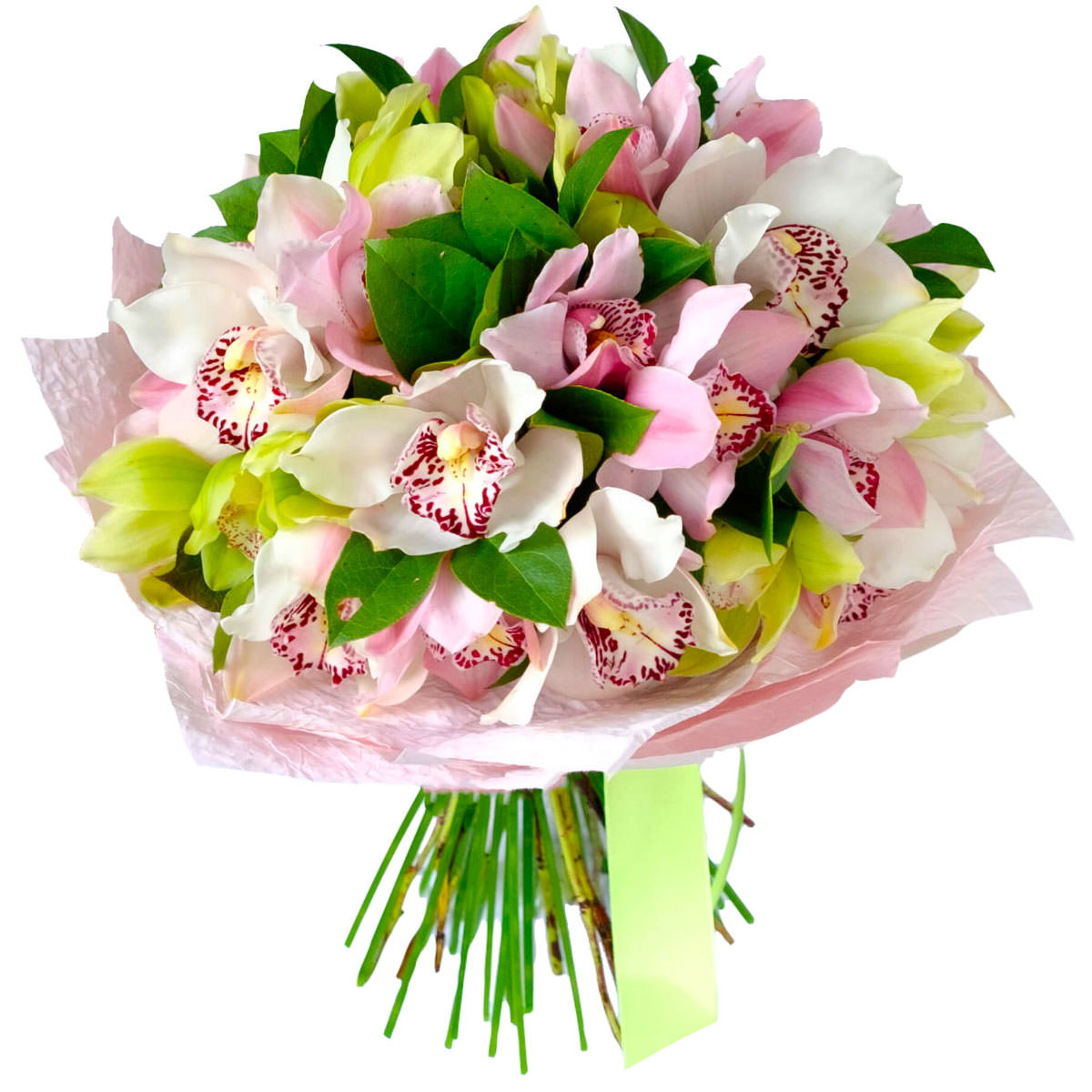 Орхидеи белые, розовые, зеленые.