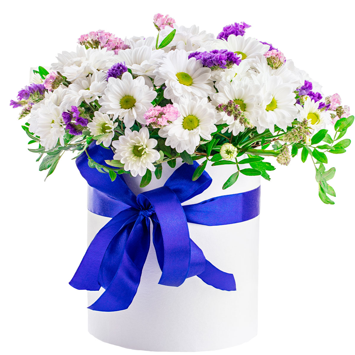 Хризантема кустовая белая, статица розовая, белая и фиолетовая, зелень. Упаковка (шляпная коробка, квадратный бокс, коробка сердце, оазис)