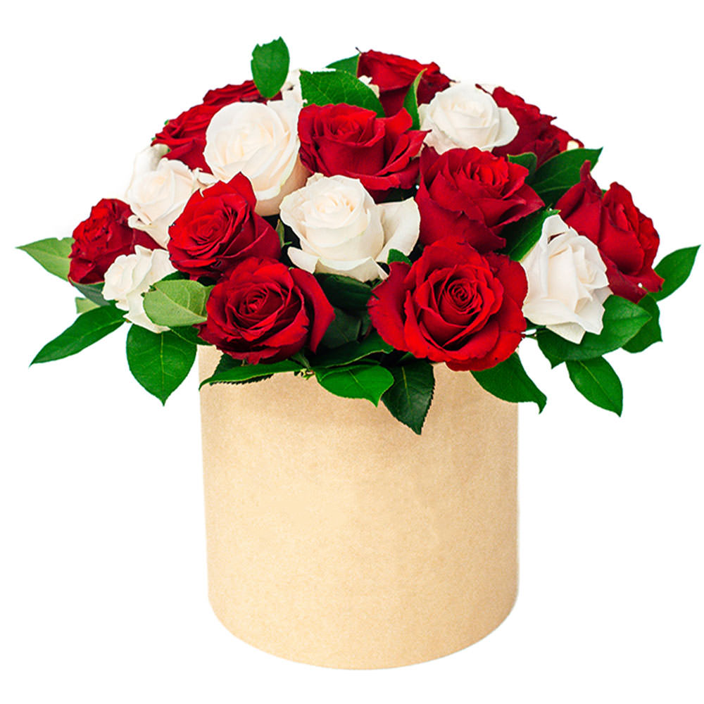 Роза одноголовая микс (белая, красная), зелень. Упаковка (шляпная коробка, квадратный бокс, коробка сердце, оазис)