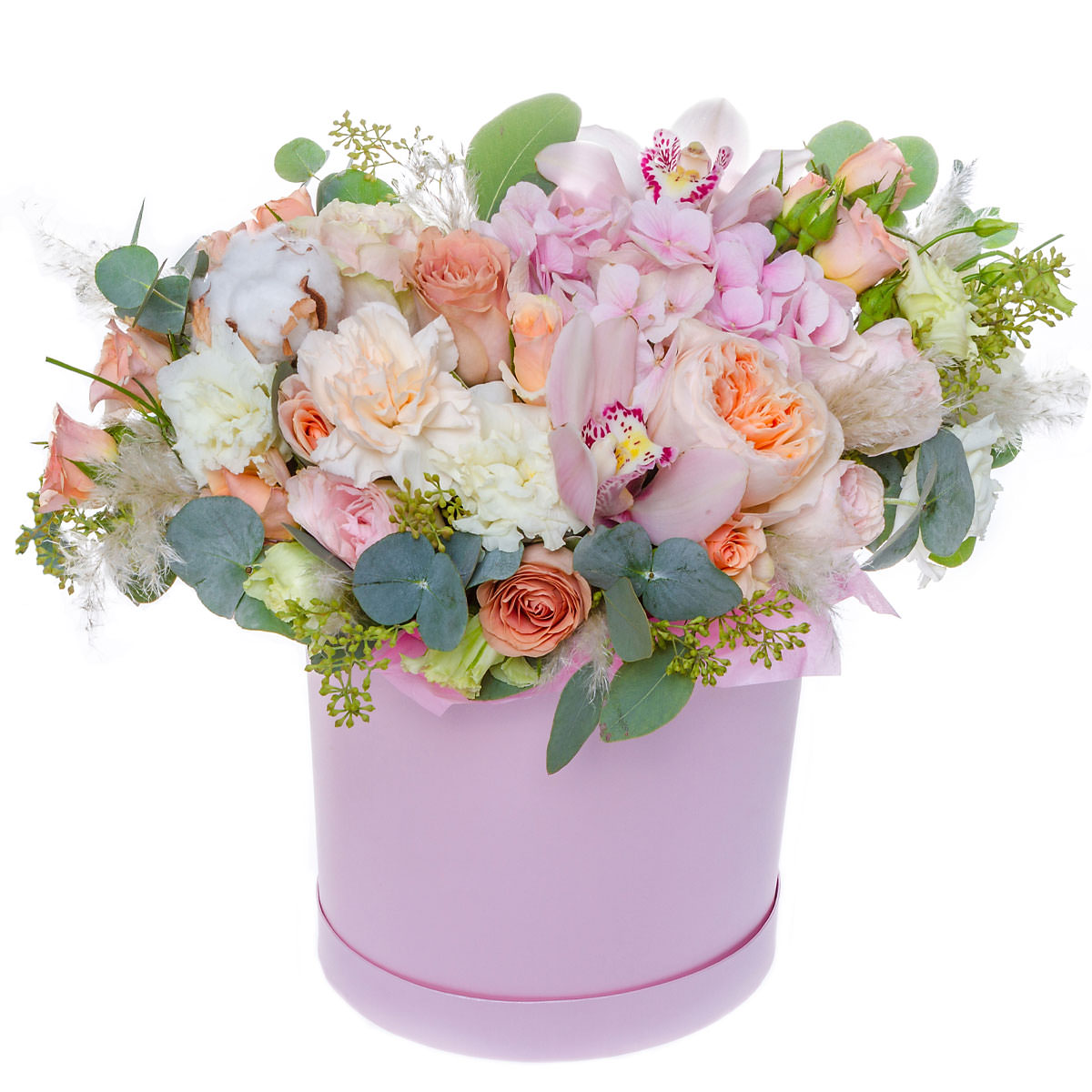 Гортензия розовая, роза пионовидная персиковая, орхидея розовая, гвоздика кремовая, эустома белая, сухоцвет, эвкалипт. Упаковка (шляпная коробка, квадратный бокс, коробка сердце, оазис)