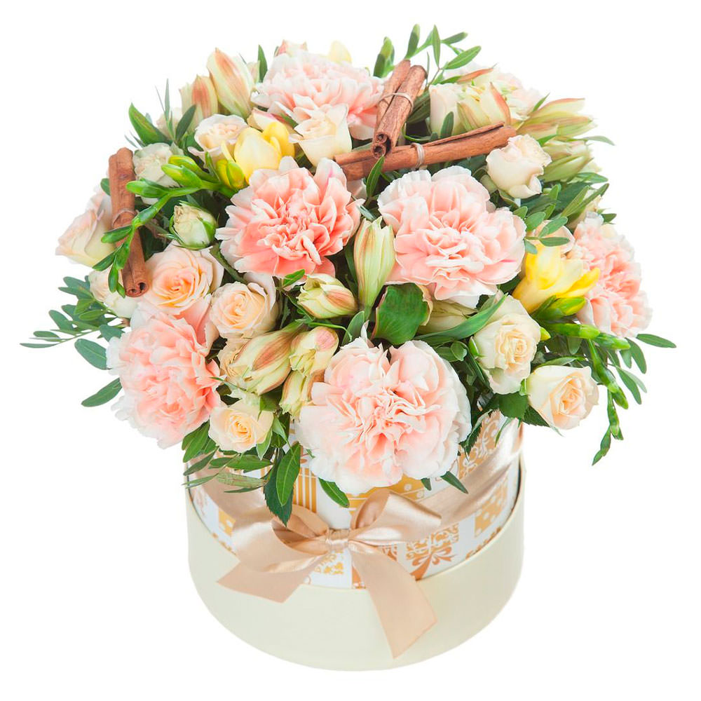 Гвоздика кремовая, альстромерия кремовая, роза кустовая кремовая, фрезия желтая, фисташка, декоративные элементы. Упаковка (шляпная коробка, квадратный бокс, коробка сердце, оазис)