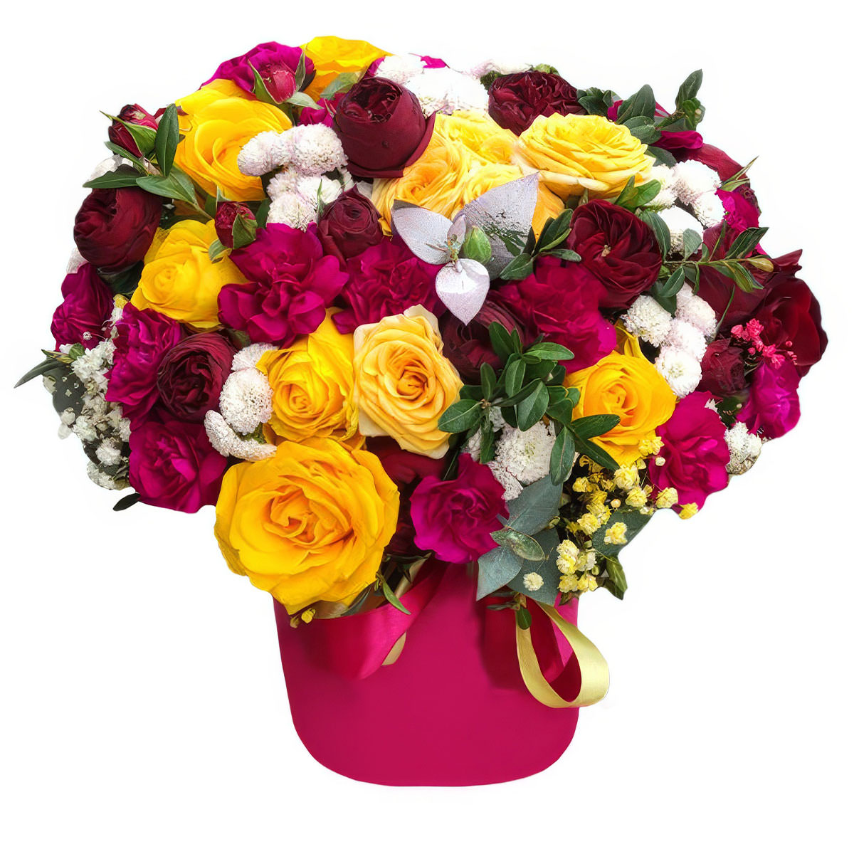 Роза кустовая желтая, роза пионовидна кустовая бордовая, гвоздика кустовая мини розовая, маргаритка мини белая, гипсофила, эвкалипт. Упаковка (шляпная коробка, квадратный бокс, коробка сердце, оазис)