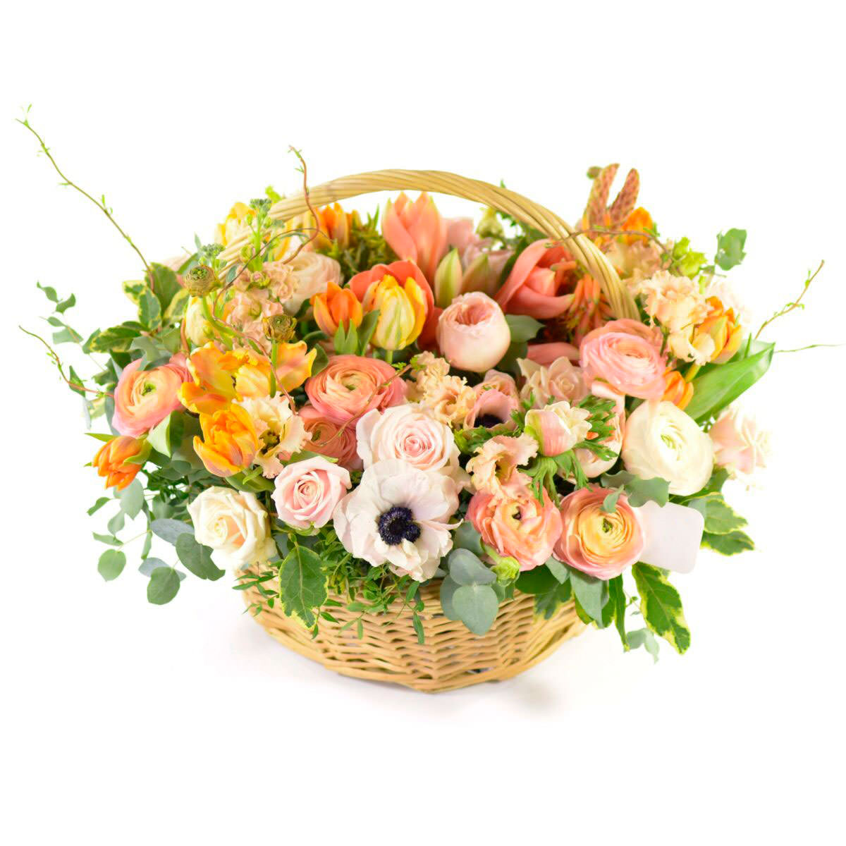 Анемон белый, ранункулюс кремовый, роза кустовая розовая, тюльпан оранжевый, эустома кремовая, гиппеаструм, фисташка, бересклет, корелиус, маттиола персиковая, эвкалипт,. Упаковка (Корзина, оазис).