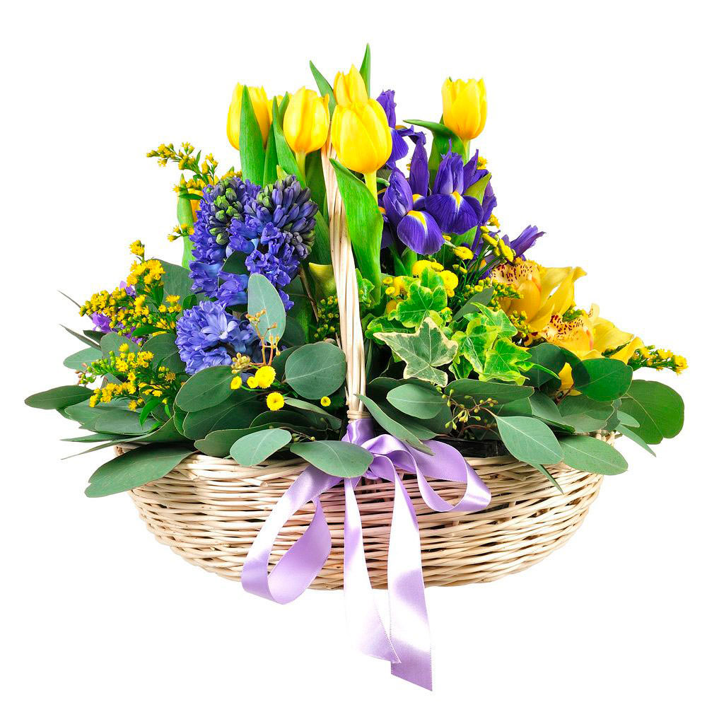 Плющ, солидаго, тюльпан желтый, ирис, гиацинт, маргаритка мини желтая, орхидея желтая, эвкалипт. Упаковка (Корзина, оазис)