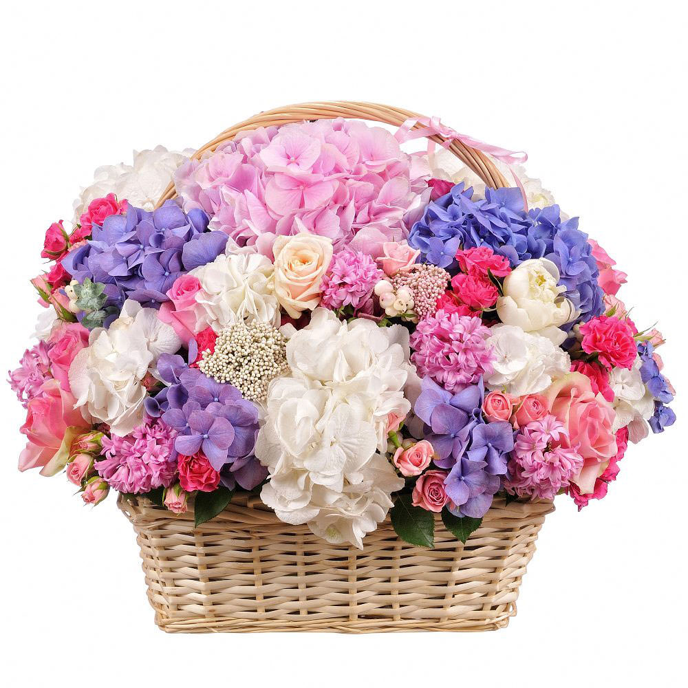 Гортензия микс (белая, розовая, фиолетовая), роза кустовая и одноголовая розовая, пион белый, гиацинт розовый, озотамнус. Упаковка (Корзина, оазис)